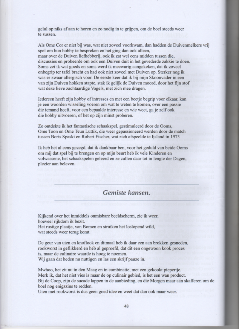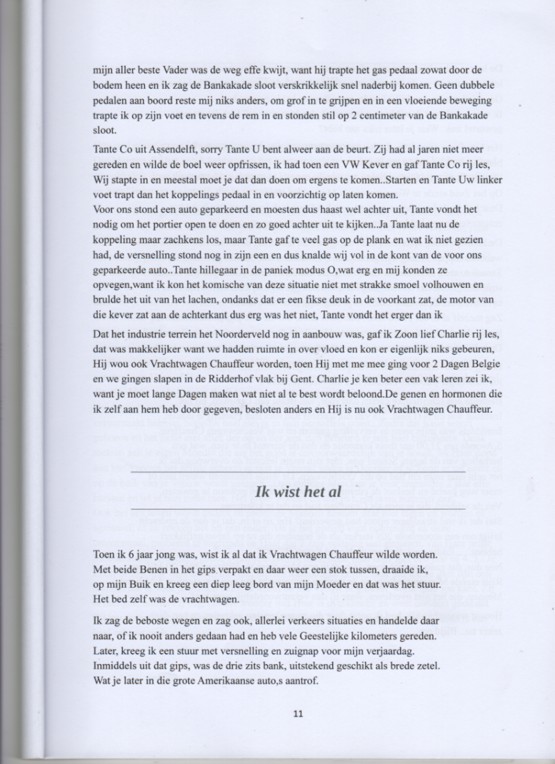 Ome Toon en Ome Teun Luttik, waren beide van tafel en bed gescheiden en moesten het na zoveel jaar huwelijk het alleen zien te rooien en dus was het toch wel een slimme zet om bij elkaar te kruipen en zo de kosten te delen. Deze Ooms waren dus weer vrijgezel geworden en kwamen regelmatig langs in mijn stam kroeg, Parkzicht aan de Wandelweg, waar ze hun biljart kunsten konden vertonen en resulteerde, dat ik elke Zondag om 11 uur hun pand op de Soenda straat bezocht en daar van beide Schaak les kreeg, daar ben ik ze nog steeds dankbaar voor,want ik schaak nog elke Dag op het Wereld wijde net en beleef daar nog steeds plezier aan. Zo heb ik in de jaren veel Koters en volwassen lieden Schaken geleerd ik had daar talent voor en had het geduld om de tegenstanders jong en oud te laten winnen en zo hun liefde voor dat edele spel te ontwikkelen, zo ook mijn Zoon Charlie, die na een jaar op de schaak club de Pion gespeeld had, zei Pa ik stop er mee want ik ga met mijn Vriendjes voet ballen bij WFC...Prima Jongen doe wat je wilt, maar de basis van het schaakspel, zat toch in zijn hersens pan en zie nu anno 2017 Dat Hij af en toe weg geef schaak speelt met de horde Jongelingen, die te maken hebben met mijn Klein dochter Melissa en dus ter aller tijden kan genieten, van dit wonderlijke spel. Rij les....Ik was al een paar jaar Vracht wagen chauffeur op een truck met oplegger waar 30.000 liter stook olie mee vervoerd kon worden. Mijn Vader ging een daggie mee naar de kern centrale te Petten in Noord-Holland.Hij had alleen een Victoria brommer gehad en verplaatse zich later op de fiets. Hij zei ik zou toch best wel eens in een auto willen rijden. Mwhoo Pa dat gaan we effe regelen, Morgen gaan we een rondje om de Bankakade. Ik had een Volkswagen Ponton en mijn Vader stapte verwachtingsvol achter het stuur; na enige uitleg gingen wij voorzichtig de Bankakade af en zei..Nu rustig naar links sturen het hoffie op en dat ging prima en nadat wij het hoffie gerond hadden, zag ik mijn grote sterke Vader veranderen in een zombie, want Hij raakte in paniek bij het naderen van de kruising..Remmen Pa zei ik, mijn aller beste Vader was de weg effe kwijt, want hij trapte het gas pedaal zowat door de bodem heen en ik zag de Bankakade sloot verskrikkelijk snel naderbij komen. Geen dubbele pedalen aan boord reste mij niks anders, om grof in te grijpen en in een vloeiende beweging trapte ik op zijn voet en tevens de rem in en stonden stil op 2 centimeter van de Bankakade sloot. Tante Co uit Assendelft, sorry Tante U bent alweer aan de beurt. Zij had al jaren niet meer gereden en wilde de boel weer opfrissen, ik had toen een VW Kever en gaf Tante Co rij les, Wij stapte in en meestal moet je dat dan doen om ergens te komen..Starten en Tante Uw linker voet trapt dan het koppelings pedaal in en voorzichtig op laten komen. Voor ons stond een auto geparkeerd en moesten dus haast wel achter uit, Tante vondt het nodig om het portier open te doen en zo goed achter uit te kijken..Ja Tante laat nu de koppeling maar zachkens los, maar Tante gaf te veel gas op de plank en wat ik niet gezien had, de versnelling stond nog in zijn een en dus knalde wij vol in de kont van de voor ons