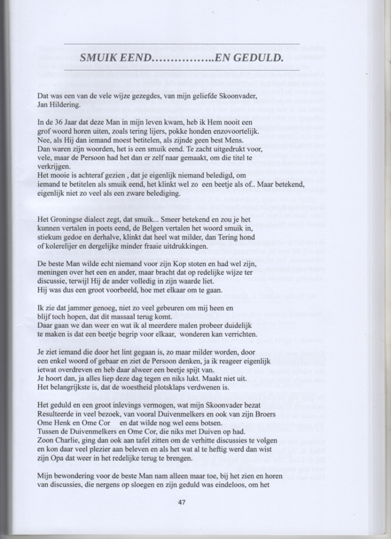 Zo zaten zij naast elkaar gezeteld op het bankkie in den uit de kluiten gewassen tuin, geduldig te wachten op de terugkeer van de mee geven Duiven, die dan uit vluchten meestal ons Buurland Belgie, zo snel mogelijk zouden terug vliegen. Als de Hildering Duiven rond om het huis cirkelden dan ontstond opwinding, bij beide Skoon ouwelui en soms paniek als die gevederde krengen niet meteen in het Hildering hok wilde belanden, om zo snel mogelijk aan de Duiven pootjes bevestigde ringen in de Duiven tijd klok te pletteren en zo mischien een van de eerste in de Zaanstreek te zijn. Ze stonden allebei midden in de tuin met voer bakkies te rammelen en te roepen, Kom maar jongens kom, soms lukte dat en soms ook niet.