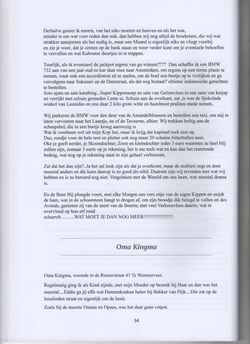 Net getrouwd met Riet......5 uur des Ochtends, toen moest men nog vroeg, uit de veren om de broodnodige centen te verdienen, het was Winter en steenkoud en dacht ik zal mijn lieve wederhelft verrassen, doormiddel van haar jurk op de potkachel te deponeren zodat, Zij een lekkere warm, kledingstuk, aan het mooie lijf kan hijsen en niet nagedacht dat het nog 3 uur zou duren voordat Riet naar beneden zou gaan en aldaar een bijna, totaal gesmolten kledingstuk zou aantreffen en hoe raar ook,Zij was niet blij. Mijn Vader en ik gingen op bezoek bij Tant Co en Ome Willem te Assendelft, Zij hadden net nieuwe meubels aangeschaft en waren bere trots. Vader Kingma rookte hele grote en dikke sigaren en vondt de ook nieuwe, asbak een pracht van een uitvinding, want er zat namelijk een gat in ter, grootte van een dikke sigaar en drukte zijn bijna opgerookte sigaar in dat, sigaren gat uit,alleen er zat geen bodem in dat gat en dus was er een, brandplek te zien in de pas aangeschafte salon tafel,ondertussen zat ik te, wiebelen in een veels te kleine niewe stoel en wiebelde dus achterover en raakte met stoel de nieuwe haardkachel met geslepen ruitjes,waarbij er 5 ruitjes naar de kloten gingen en de rug van de stoel ook rijp was om die bij, het grof vuil te zetten,enigzins beschaamd verlieten wij het pand aan de, Dorpsstraat te Assendelft,in de gang van het pand waarin ik de jas ging, aantrekken en dat ging nogal onbesuisd in die tijd, nam ik ook nog even de, nieuwe ganglamp mee en die lag dus aan gruzelementen. Tante mogen wij nog es een keer langskomen?...Was de hamvraag. De eerste keer dat ik met de Ouders van Riet kennis maakte. Netjes een handje gegeven en nam plaats op de bank, waar ik onmiddelijk, doorheen zakte en de bank was dus min of meer onbruikbaar geworden, van schrik schoot ik omhoog en niet wetende dat daar alweer een lamp hing, en die hing er niet meer, nee hij lag plotsklaps op de vloer,nerveus door het, gebeuren in een nieuwe omgeving met je aanstaande Schoonouders, vluchte ik naar daar, waarvan ik dacht dat daar de W.C. zat....Mis, die zat aan de andere kant van het pand, wist ik veel en ik dacht, moet, effies koortsachtig nadenken van hoe redt ik me hier op fatsoenlijke wijze uit? Maar bij het opentrekken van de deur die naar de W.C. zou leiden, hield ik plotsklaps de deur kruk in mijn hand..Gewoon afgebroken zallen we maar zeggen. Mijn Schoonvader een hele bovenste beste Man zei de volgende onovertroffen, woorden in een rustig blijvend tempo...Ga jij dus mijn Schoonzoon worden? Dit was dus ook een oudje uit de Hyves periode en moet er effe bij zeggen, dat dit waar gebeurd is.
