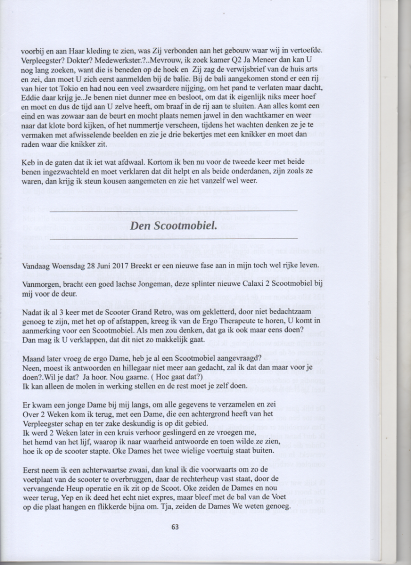 Net 6 jaar geworden, ging mijn Vader mijn klompen bekijken, of er mischien een spijker in zat, want ik begon mank te lopen, zodanig dat het consult bij de Orthopeed Dr. Ties, uitslag bracht van... Uw Zoontje heeft een Morbus Phertus. Wat nu bij elk geboren Kind gecontroleerd wordt. Ik moest dus plotsklaps als levendig Kereltje plat op bed liggen wat meteen naar beneden gebracht werd, een Week later had ik een gipsbroek aan met een stok tussen mijn Benen, ook hier snapte ik niks van, maar aanvaarde dat als een gegeven en dat duurde 2 jaar lang en heb daar eigenlijk geen nare herhinneringen van, mijn Vriendjes kwamen gewoon op bezoek en Juf de Vries kwam Woensdag middag langs om de school West stof bij te brengen. Wel moest ik om de 2 Maanden weer naar het Sint Jan Ziekenhuis om nieuw gips aan te meten, om dat ik dat door wilde bewegingen naar de gallemiezen had geholpen. Ik vroeg wat aan het team wat het nieuwe gips moest bewerkstelligen en kreeg het antwoord...Smoel houwen en dat dee ik ook dan maar wijselijk. Net zoals een van de Nonnen die in het Sint Jan Ziekenhuis werkte, zei Handen boven je dek, herhaaldelijk hoorde ik dat en begreep er geen moer van. Zelf bevlekking of mastrubatie, was ten strengste verboden..6 Jaar dan komt dat geneens bij je op. Buiten dat waren ze ontzettend lief voor je. Later kreeg ik een beugel en verhoogde schoen aangemeten, maar donderstraalde die klote dingen aan de kant, als we op het schoolplein gingen voetballen of hocky speelde. Nu heb ik al 13 jaar een kunst heup, wat enige ongemakken met zich mee brengt, maar de pijn is foetsie en das wel zo belangrijk. Wordt vervolgd