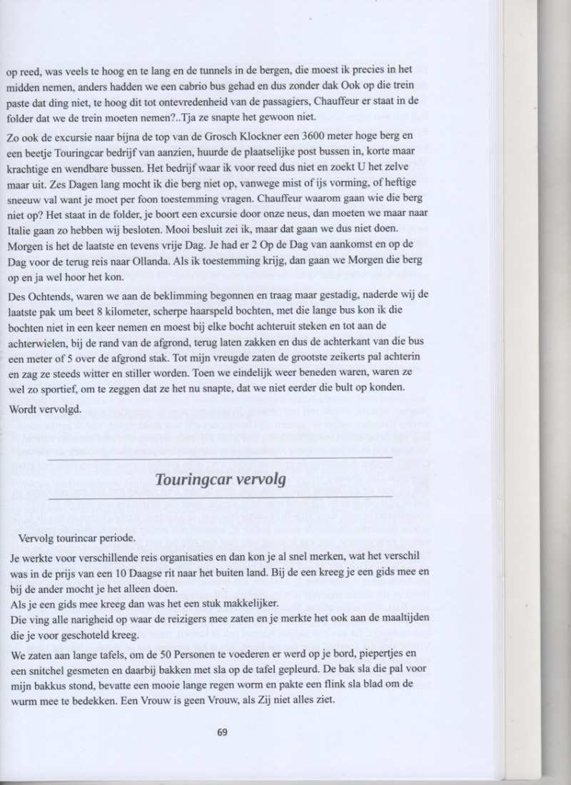 paste dat ding niet, te hoog dit tot ontevredenheid van de passagiers, Chauffeur er staat in de folder dat we de trein moeten nemen?..Tja ze snapte het gewoon niet. Zo ook de excursie naar bijna de top van de Grosch Klockner een 3600 meter hoge berg en een beetje Touringcar bedrijf van aanzien, huurde de plaatselijke post bussen in, korte maar krachtige en wendbare bussen. Het bedrijf waar ik voor reed dus niet en zoekt U het zelve maar uit. Zes Dagen lang mocht ik die berg niet op, vanwege mist of ijs vorming, of heftige sneeuw val want je moet per foon toestemming vragen. Chauffeur waarom gaan wie die berg niet op? Het staat in de folder, je boort een excursie door onze neus, dan moeten we maar naar Italie gaan zo hebben wij besloten. Mooi besluit zei ik, maar dat gaan we dus niet doen. Morgen is het de laatste en tevens vrije Dag. Je had er 2 Op de Dag van aankomst en op de Dag voor de terug reis naar Ollanda. Als ik toestemming krijg, dan gaan we Morgen die berg op en ja wel hoor het kon. Des Ochtends, waren we aan de beklimming begonnen en traag maar gestadig, naderde wij de laatste pak um beet 8 kilometer, scherpe haarspeld bochten, met die lange bus kon ik die bochten niet in een keer nemen en moest bij elke bocht achteruit steken en tot aan de achterwielen, bij de rand van de afgrond, terug laten zakken en dus de achterkant van die bus een meter of 5 over de afgrond stak. Tot mijn vreugde zaten de grootste zeikerts pal achterin en zag ze steeds witter en stiller worden. Toen we eindelijk weer beneden waren, waren ze wel zo sportief, om te zeggen dat ze het nu snapte, dat we niet eerder die bult op konden. Wordt vervolgd.