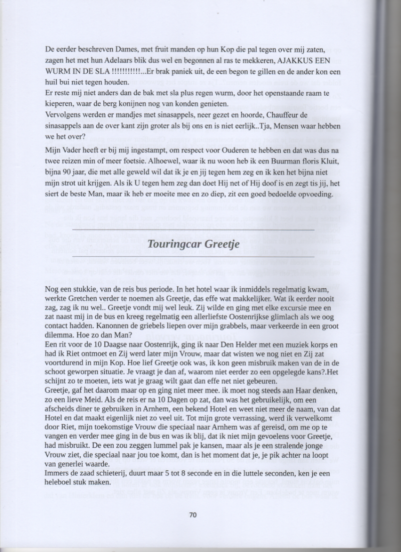 Vervolg tourincar periode. Je werkte voor verschillende reis organisaties en dan kon je al snel merken, wat het verschil was in de prijs van een 10 Daagse rit naar het buiten land. Bij de een kreeg je een gids mee en bij de ander mocht je het alleen doen. Als je een gids mee kreeg dan was het een stuk makkelijker. Die ving alle narigheid op waar de reizigers mee zaten en je merkte het ook aan de maaltijden die je voor geschoteld kreeg. We zaten aan lange tafels, om de 50 Personen te voederen er werd op je bord, piepertjes en een snitchel gesmeten en daarbij bakken met sla op de tafel gepleurd. De bak sla die pal voor mijn bakkus stond, bevatte een mooie lange regen worm en pakte een flink sla blad om de wurm mee te bedekken. Een Vrouw is geen Vrouw, als Zij niet alles ziet. De eerder beschreven Dames, met fruit manden op hun Kop die pal tegen over mij zaten, zagen het met hun Adelaars blik dus wel en begonnen al ras te mekkeren, AJAKKUS EEN WURM IN DE SLA !!!!!!!!!!!...Er brak paniek uit, de een begon te gillen en de ander kon een huil bui niet tegen houden.