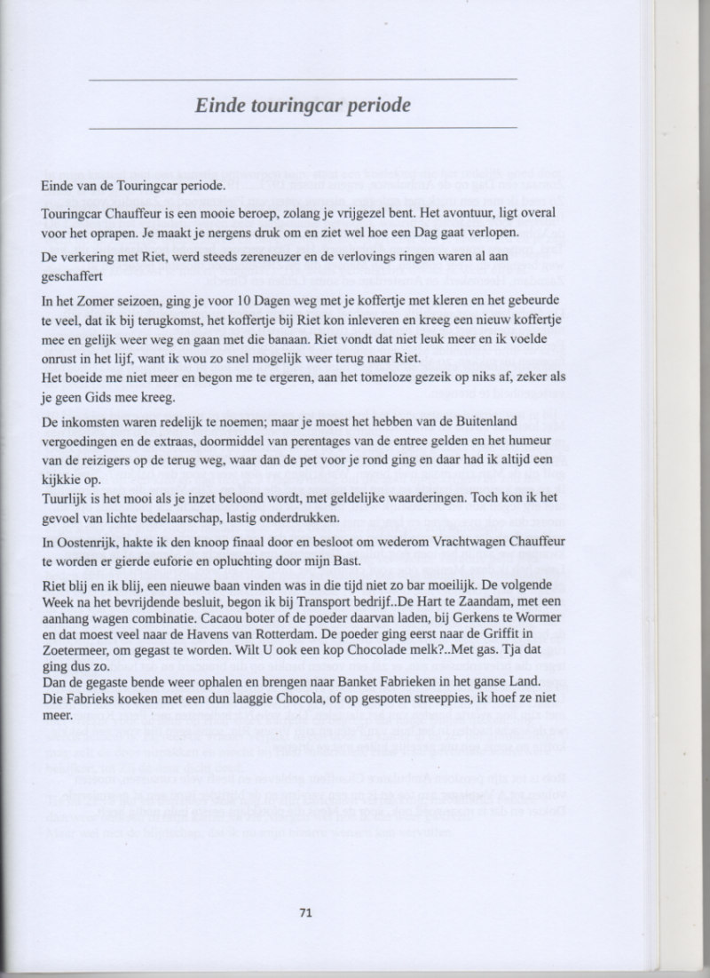Touringcar Chauffeur is een mooie beroep, zolang je vrijgezel bent. Het avontuur, ligt overal voor het oprapen. Je maakt je nergens druk om en ziet wel hoe een Dag gaat verlopen. De verkering met Riet, werd steeds zereneuzer en de verlovings ringen waren al aan geschaffert In het Zomer seizoen, ging je voor 10 Dagen weg met je koffertje met kleren en het gebeurde te veel, dat ik bij terugkomst, het koffertje bij Riet kon inleveren en kreeg een nieuw koffertje mee en gelijk weer weg en gaan met die banaan. Riet vondt dat niet leuk meer en ik voelde onrust in het lijf, want ik wou zo snel mogelijk weer terug naar Riet. Het boeide me niet meer en begon me te ergeren, aan het tomeloze gezeik op niks af, zeker als je geen Gids mee kreeg. De inkomsten waren redelijk te noemen; maar je moest het hebben van de Buitenland vergoedingen en de extraas, doormiddel van perentages van de entree gelden en het humeur van de reizigers op de terug weg, waar dan de pet voor je rond ging en daar had ik altijd een kijkkie op. Tuurlijk is het mooi als je inzet beloond wordt, met geldelijke waarderingen. Toch kon ik het gevoel van lichte bedelaarschap, lastig onderdrukken. In Oostenrijk, hakte ik den knoop finaal door en besloot om wederom Vrachtwagen Chauffeur te worden er gierde euforie en opluchting door mijn Bast. Riet blij en ik blij, een nieuwe baan vinden was in die tijd niet zo bar moeilijk. De volgende Week na het bevrijdende besluit, begon ik bij Transport bedrijf..De Hart te Zaandam, met een aanhang wagen combinatie. Cacaou boter of de poeder daarvan laden, bij Gerkens te Wormer en dat moest veel naar de Havens van Rotterdam. De poeder ging eerst naar de Griffit in Zoetermeer, om gegast te worden. Wilt U ook een kop Chocolade melk?..Met gas. Tja dat ging dus zo. Dan de gegaste bende weer ophalen en brengen naar Banket Fabrieken in het ganse Land. Die Fabrieks koeken met een dun laaggie Chocola, of op gespoten streeppies, ik hoef ze niet meer.