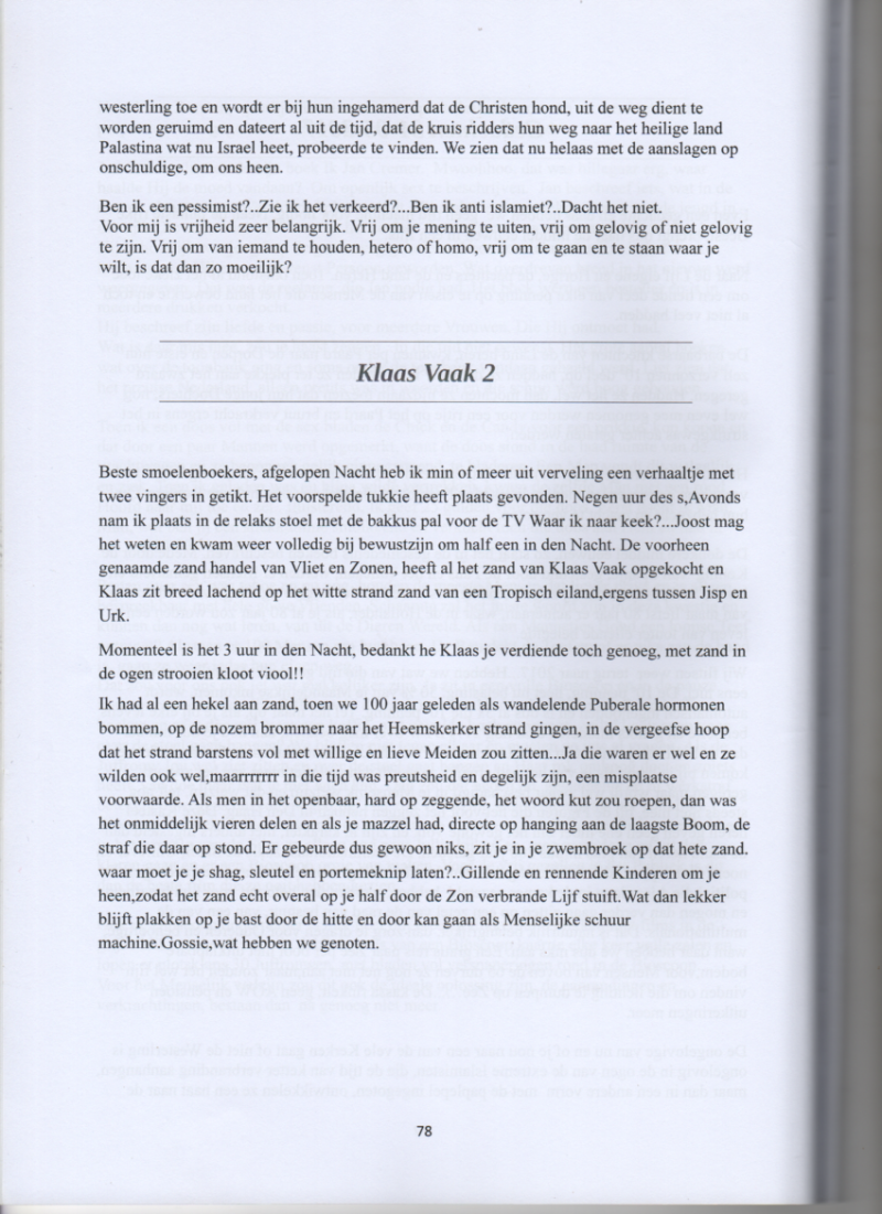 Beste smoelenboekers, afgelopen Nacht heb ik min of meer uit verveling een verhaaltje met twee vingers in getikt. Het voorspelde tukkie heeft plaats gevonden. Negen uur des s,Avonds nam ik plaats in de relaks stoel met de bakkus pal voor de TV Waar ik naar keek?...Joost mag het weten en kwam weer volledig bij bewustzijn om half een in den Nacht. De voorheen genaamde zand handel van Vliet en Zonen, heeft al het zand van Klaas Vaak opgekocht en Klaas zit breed lachend op het witte strand zand van een Tropisch eiland,ergens tussen Jisp en Urk.